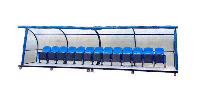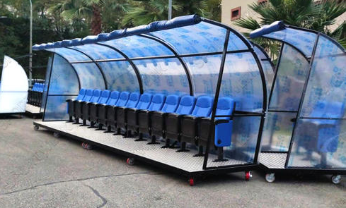 Скамейка на мобильной платформе на колесах для запасных игроков: с козырьком из ячеистого поликарбоната в комплекте с защитными вставками и мягкими креслами из экокожи.