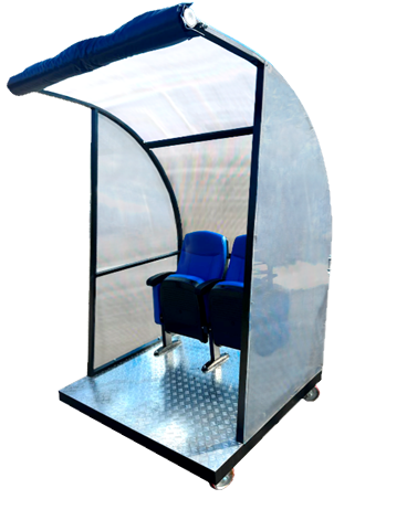 Скамейка на мобильной платформе на колесах для запасных игроков: с козырьком из ячеистого поликарбоната в комплекте с защитными вставками и мягкими креслами из экокожи.