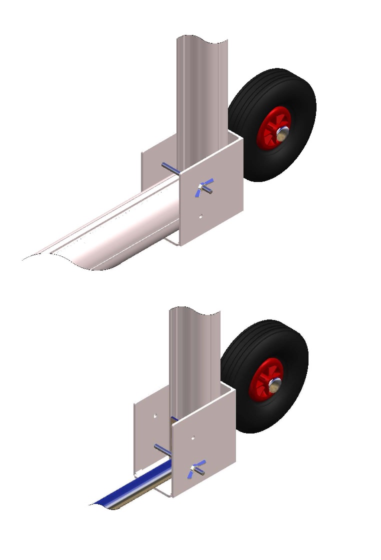 Колеса предназначены для транспортировки футбольных ворот к месту их использования или хранения. С помощью кронштейна и втулки колеса прикрепляются к штангам ворот и в наклонном положении могут передвигаться одним человеком в нужное место. Далее кронщтейн отсоединяется от конструкции ворот, и они принимают рабочее состояние.