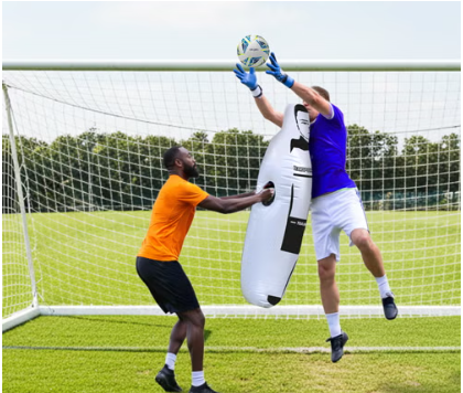Воздушное наполнение обеспечивает мягкую, контролируемую амортизацию (удары между тренером вратарей и самим вратарем смягчаются, что позволяет проводить интенсивные тренировки один на один без излишнего напряжения или повышенного риска травм). Это означает, что блокирующий манекен предотвращает риски в поединках, не теряя при этом реалистичности. Две прикрепленные ручки обеспечивают точное управление.